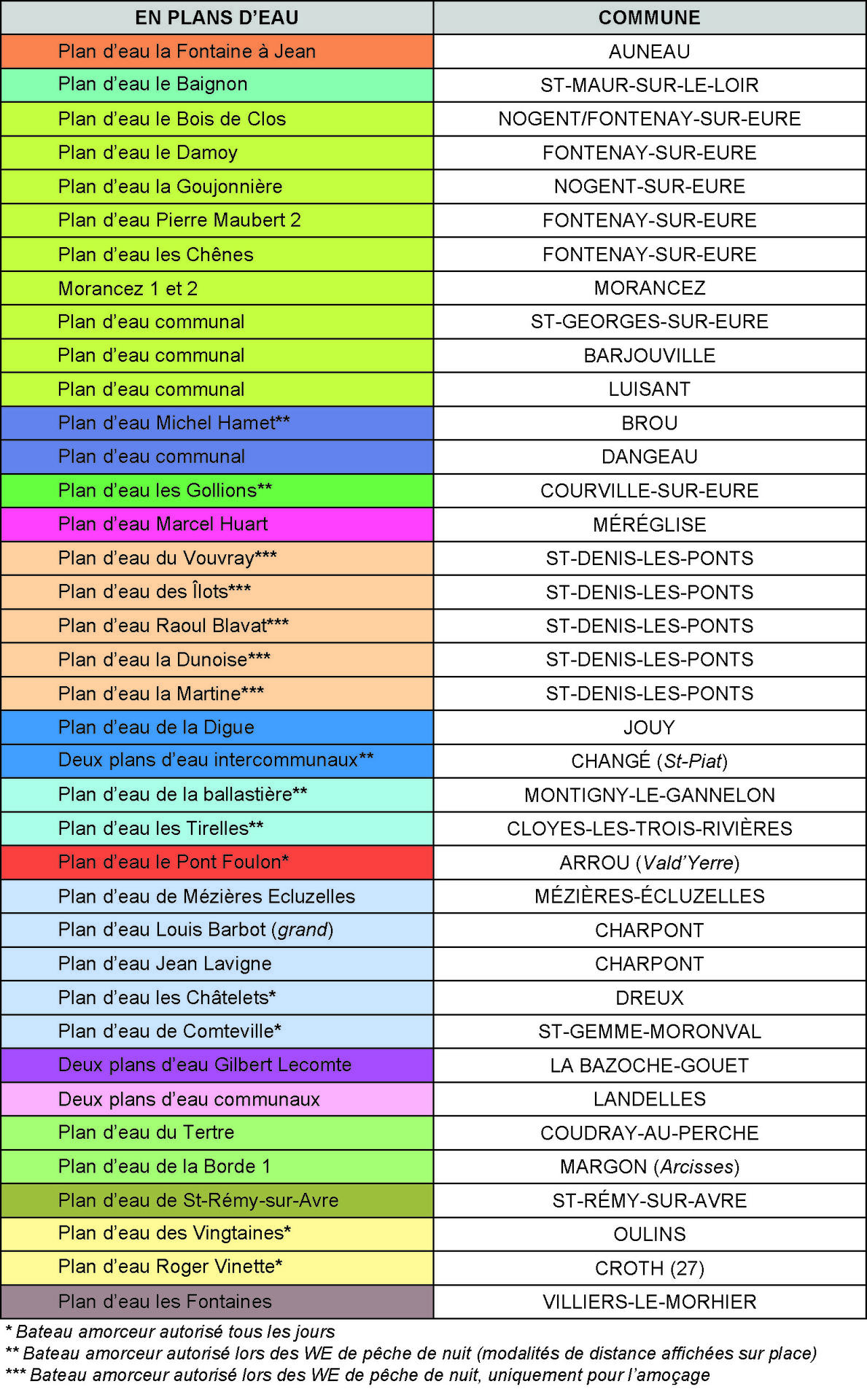 • Bateau amorceur interdit sauf plans d’eau ci-dessous avec des astérisques (*)